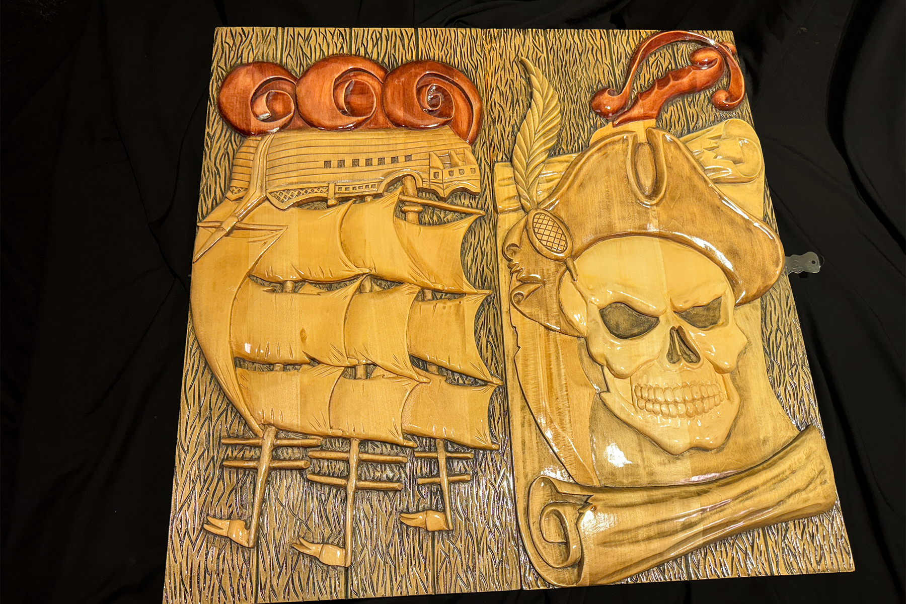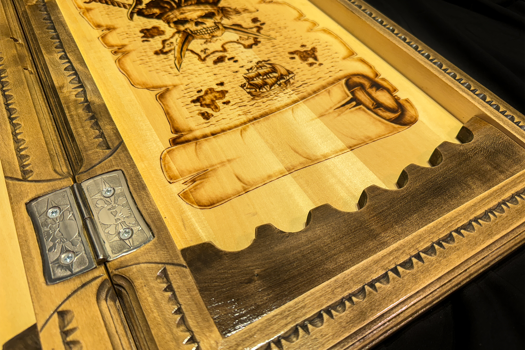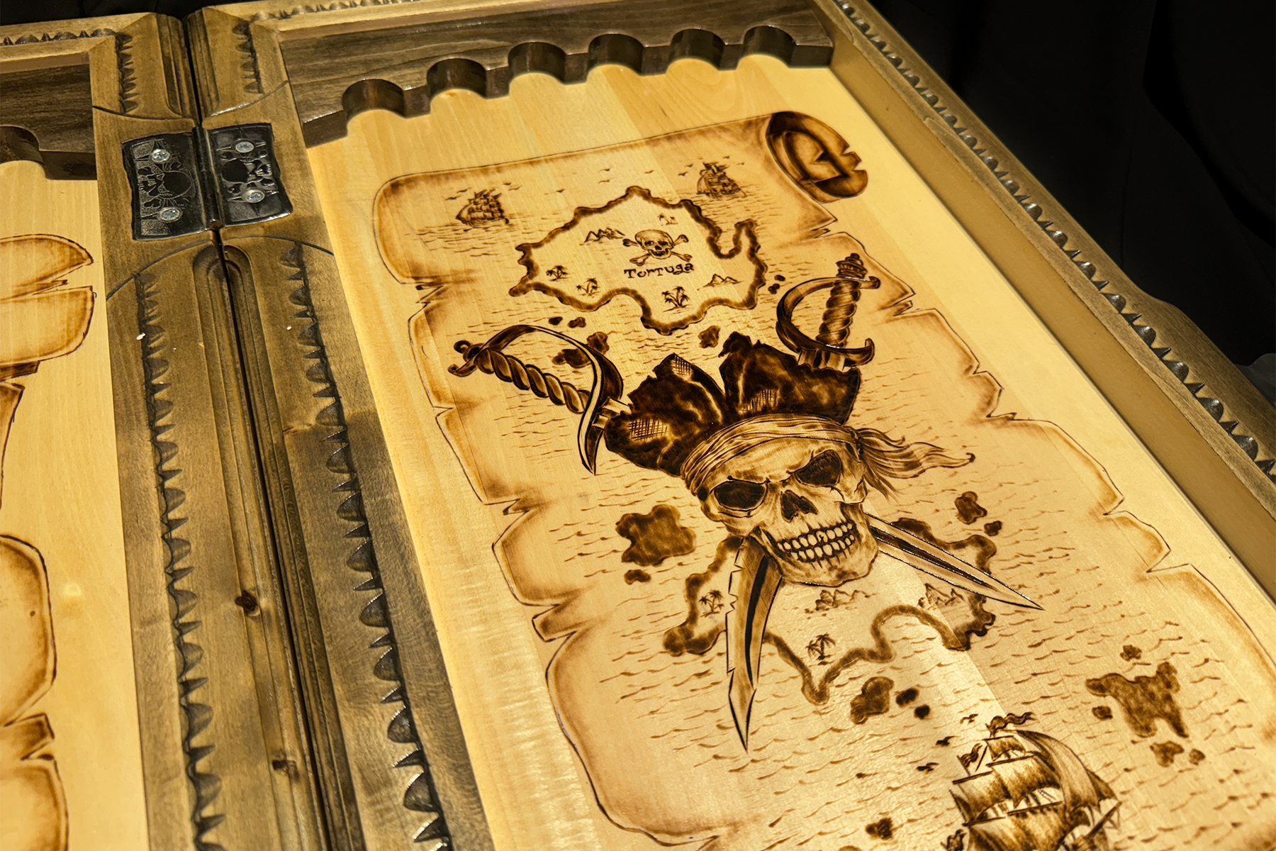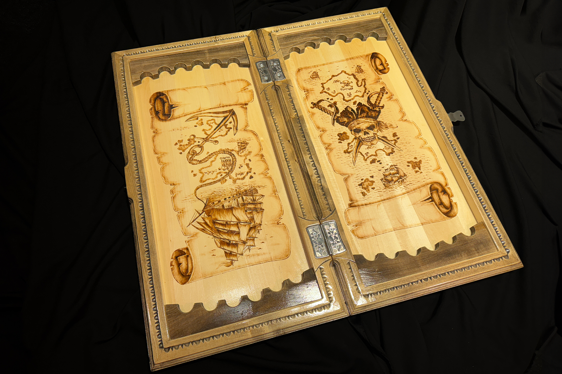 Aceste table din lemn, lucrate manual, te poartă într-o lume a aventurilor pe mare. Pe o parte a tablei este sculptat un craniu de pirat cu pălărie și o hartă cu comoara ascunsă. Pe cealaltă parte, un vas de pirați navighează curajos printre valuri. Fiecare detaliu al sculpturii reflectă spiritul pirateriei și aventurii. Tablele „Odiseea Piratului” nu sunt doar un joc, ci și un element decorativ captivant, ideal pentru iubitorii de povești maritime și obiecte de artizanat unice.